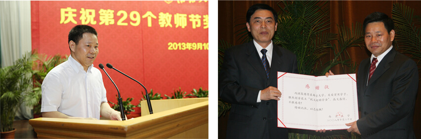 2013年9月10日下午,在南京大學(xué)“慶祝第29個教師節(jié)獎教金頒獎典禮”上,由雨潤控股集團(tuán)命名的首屆“雨潤教學(xué)終身成就獎”,在其鼓樓校區(qū)大禮堂正式揭曉,兩位長期堅持在教學(xué)第一線的老教授——盧德馨和王守仁,共同分享這一殊榮。南京大學(xué)校長陳駿和雨潤控股集團(tuán)董事長祝義財一起為獲獎?wù)哳C獎,每人各獲獎勵金額20萬元整。這是迄今為止南京大學(xué)頒出的數(shù)額最高的單項獎教金。